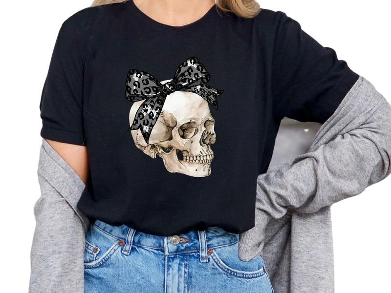 Skull with Cheetah Bow Women's Top, Graphic Shirt, Skull Shirt, Tie Dye Shirt, Casual Cotton Shirt for Women, Graphic Tee, Sarcastic, Womenswear, Streetwear, Tshirt Crewneck Short Sleeve Adult Homor T-Shirt, Leopard Print, Cheetah Print, Halloween Shirt